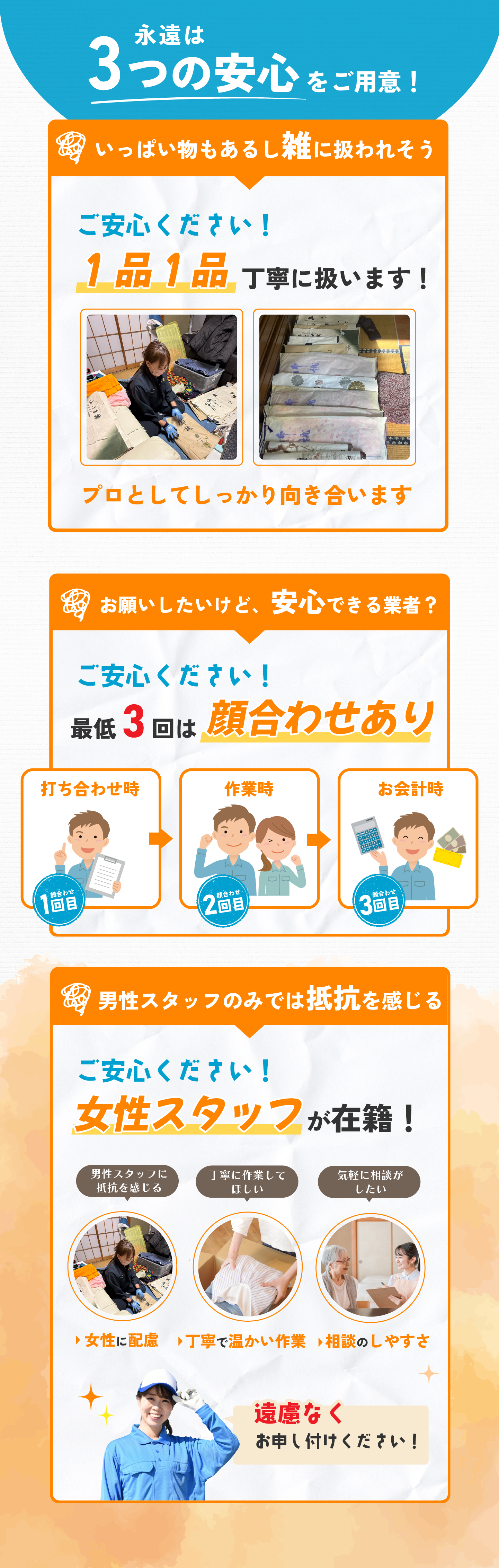 株式会社永遠 (以下「当社」)は、以下のとおり個人情報保護方針を定め、 個人情報保護の仕組みを構築し、全従業員に個人情報保護の重要性の認識と取組みを 徹底させることにより、個人情報の保護を推進致します。 個人情報の管理 当社は、お客さまの個人情報を正確かつ最新の状態に保ち、個人情報への不正アクセス・紛失・破損・改ざん・漏洩などを防止するため、セキュリティシステムの維持・管理体制の整備・社員教育の徹底等の必要な措置を講じ、安全対策を実施し個人情報の厳重な管理を行ないます。